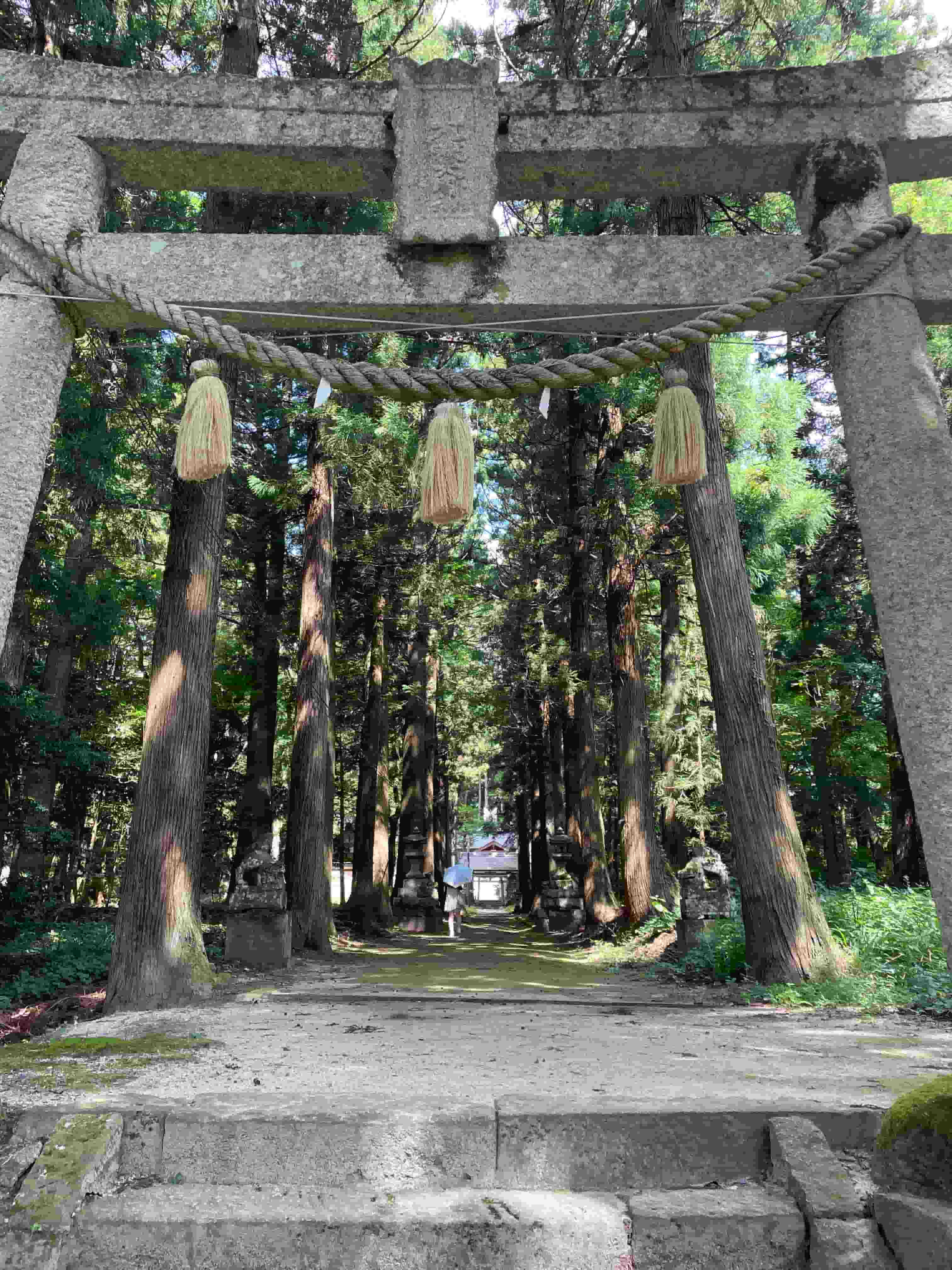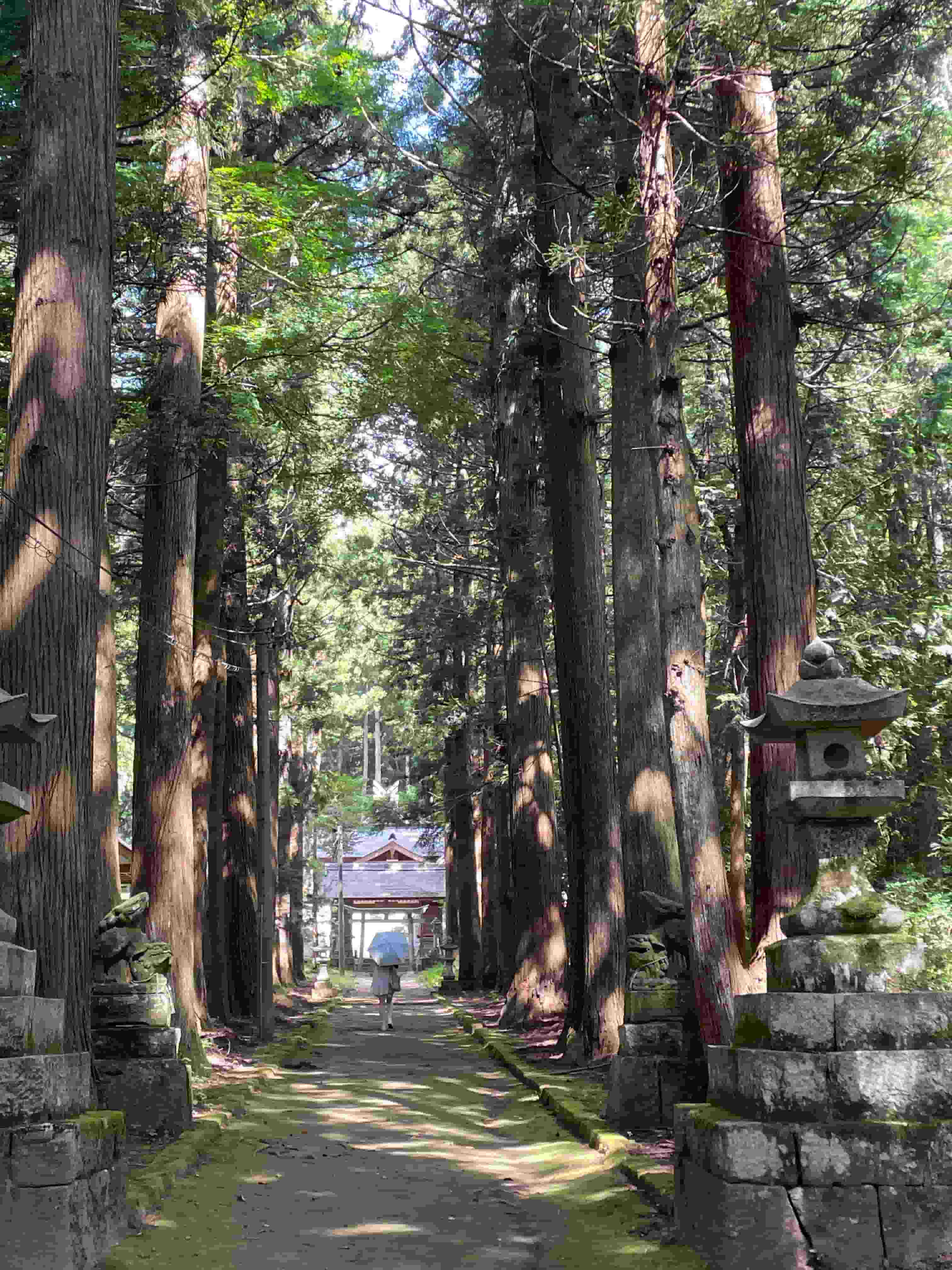 100m続く杉並木のが良い雰囲気を出している。奥のパラソルをさしているのはお姉ちゃん